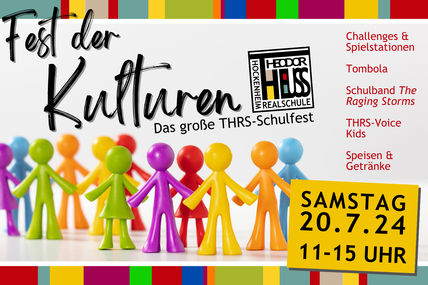 Am Samstag, 20. Juli von 11 bis ca. 15 Uhr , veranstaltet die Theodor-Heuss-Realschule (THRS) Hockenheim wieder ihr großes Schulfest „Fest der Kulturen“. Auf dem und um das Schulgelände in der Schubertstraße 14 bieten die Klassen verschiedene kulinarische Stände, aber vor allem auch aktive und begeisternde Stationen und Stände an. Das Thema sind die Kulturen und Länder der Welt. Im Vorfeld haben die Klassen per Losverfahren Länder der Erde gezogen, zu denen sie einen Beitrag, z.B. als Mitmachstation, Lernangebot oder Spezialitätenstand, umsetzen und dabei die eine oder andere Besonderheit des Landes oder des Kontinents betonen. Beim Challenge-Programm der Mitmachenstationen ist auch eine Tombola angedockt: wer bei ausreichend Mitmachstationen aktiv ist, erlangt eine Karte für die Tombola. Daneben wird die Band „The Raging Storms“, die aus ehemaligen Schülerinnen und Schülern hervorgegangen ist, sowie die Schulband „Mr. Pipe“ spielen. Daneben soll es erstmals den Gesang- und Performance-Wettbewerb „THRS-Voice Kids“ geben.