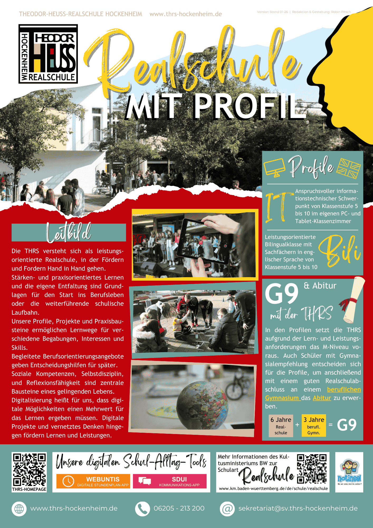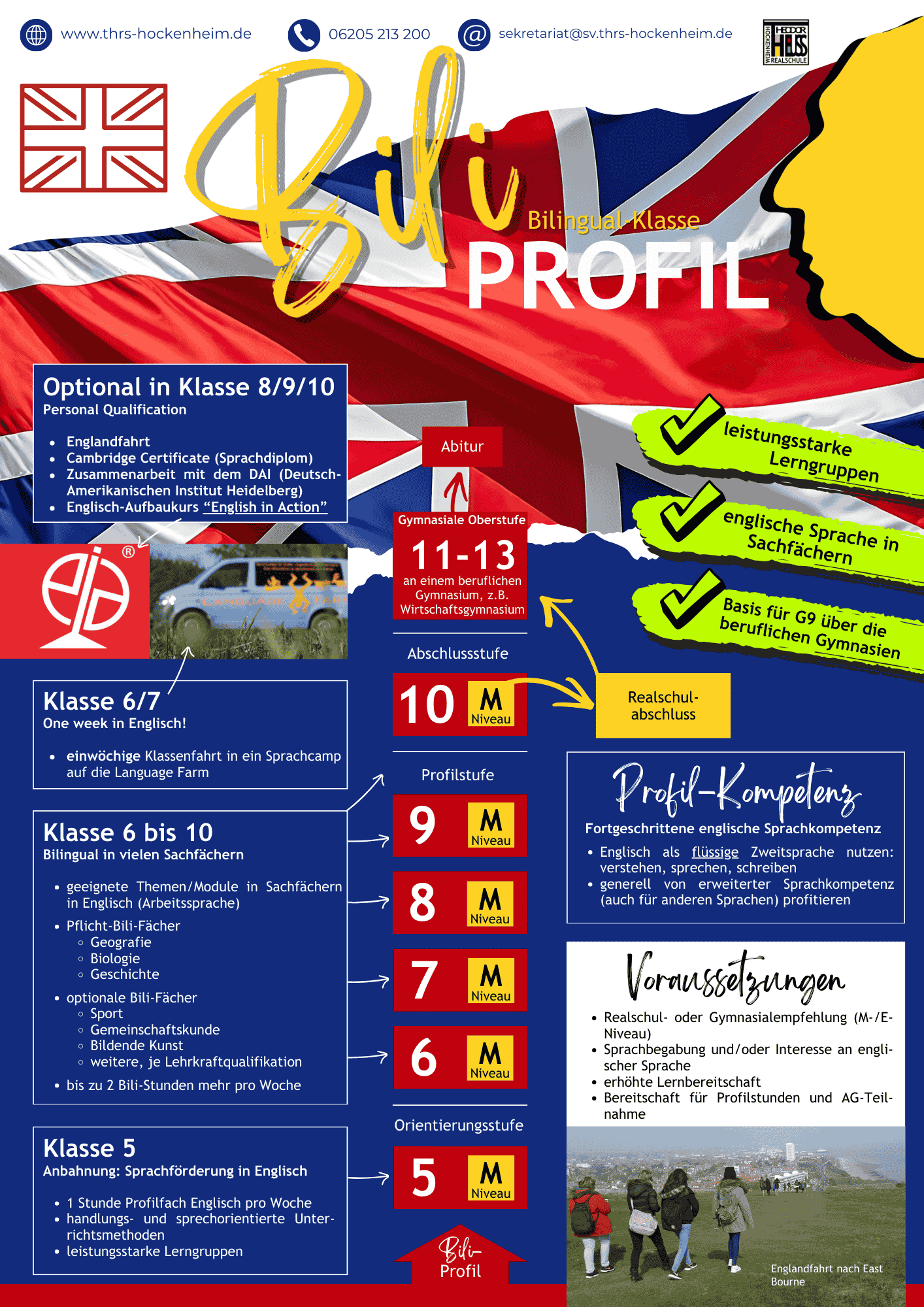 „Bili“ steht für „bilingual“ und bedeutet „zweisprachig“, denn in der Bili-Klasse wird schon lange Vieles neben Deutsch auch auf Englisch unterrichtet, als gleichberechtigte Unterrichtssprache – ein Erfolgsmodell. Damals noch als offizieller Schulversuch eingerichtet darf die THRS seit 2013 das Landesprädikat „Realschule mit bilingualem Zug“ führen. Auch in Sachen Leistung sind unsere Bili-Schüler oft vorne mit dabei. Viele absolvieren nach dem Realschulabschulabschluss nach drei weiteren Jahren an einem beruflichen Gymnasium das Abitur. Mit der Carl-Theodor-Schule (CTS) in Schwetzingen und dem dortigen internationalen Profil besteht eine Kooperation.