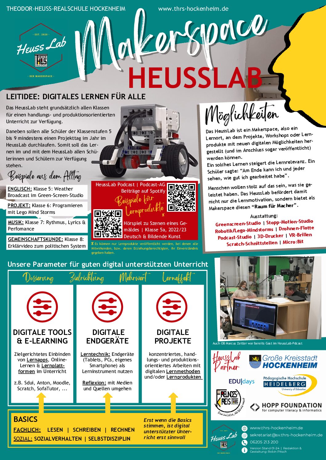 Mit dem HeussLab wollen wir Lernprozesse von Schülern über den motivationalen Mehrwert digitaler Prdoukte, die am Ende der kleinen, projektorientierten Lerneinheiten stehen unterstützen. Wir haben dafür an der THRS eine multimediale Arbeitsumgebung mit digitalen In- und Output-Werkzeugen geschaffen. Podcast, Trickfilm, Greenscreen, Virtual Reality, Drohnenflug, … motivierende Werkzeuge und Instrumente, die zum Lernen anspornen sollen und optimalerweise in jedem Fach eingesetzt werden sollen und können. Unser HeussLab soll Katalysator für ein erfahrungs- und produktionsorientiertes Lernen sein und das klassische, schulische Lernen ergänzen.